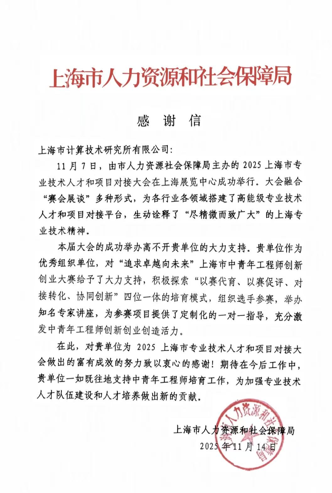 近日,上海市人力資源社會保障局向上海市計算技術研究所有限公司發來感謝信。...